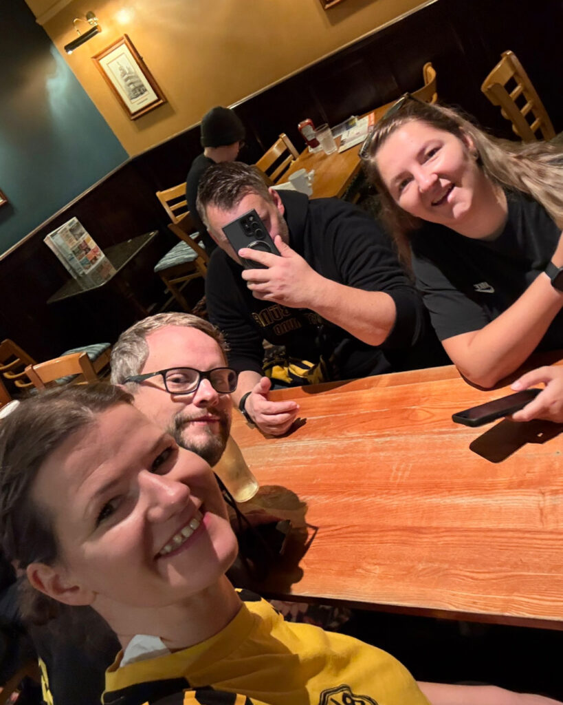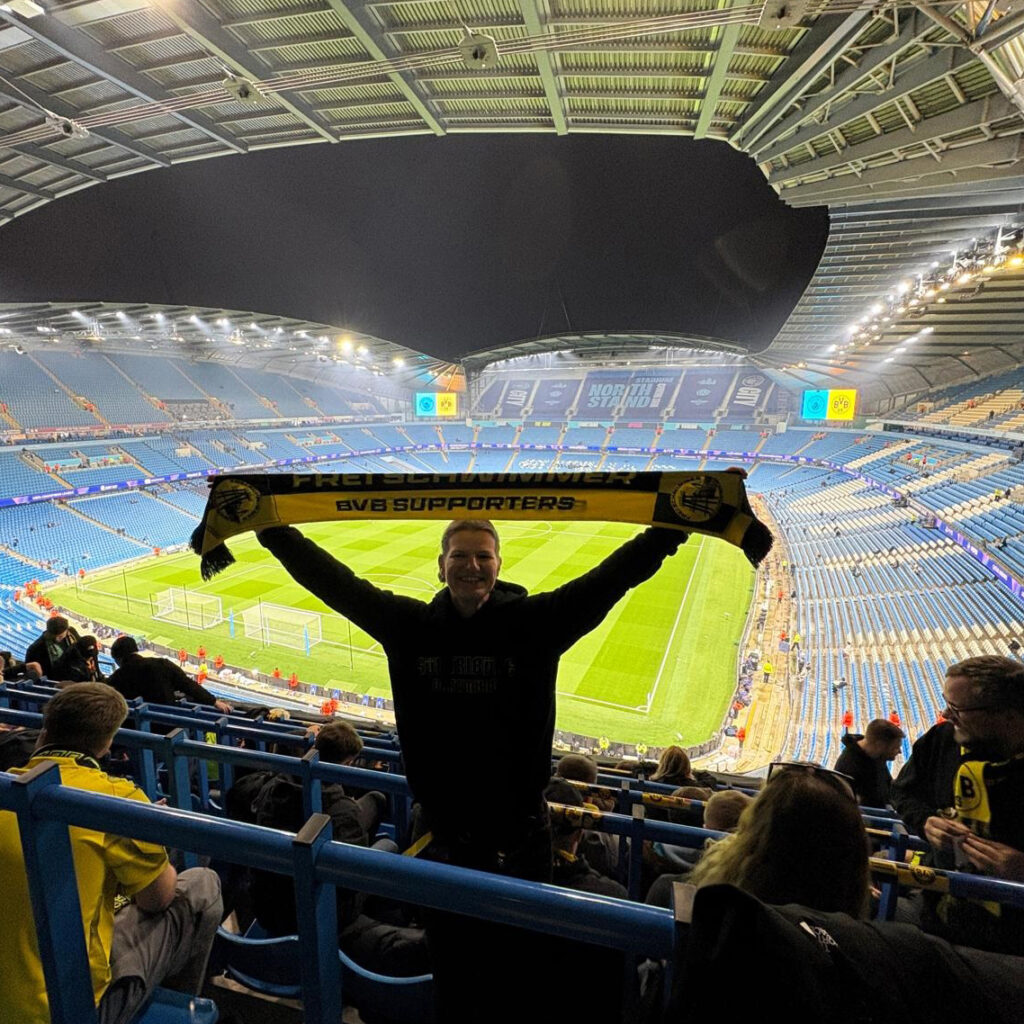 Während des Verzehrens der flüssigen und festen Nahrung lief das Vernetzen innerhalb der BVB-Anhänger auf Hochtouren. Gerade international ergeben sich zahlreiche Begegnungen, die der gesamten Unternehmung Auswärtsfahrt eine besondere Würze, gespickt mit viel Spaß anreichern. In Manchester waren es besonders die Rennsteig-Borussen, FC Schwarz Gelbe Liebe 84 und die Feuchten Igelschnäuzchen, die nach dem Stickertausch die Gespräche inspirierten mit Anekdoten und Dönekes. Der Humor schadet jedenfalls nicht als Spielvorbereitung. Besonders vor einem Match gegen City.